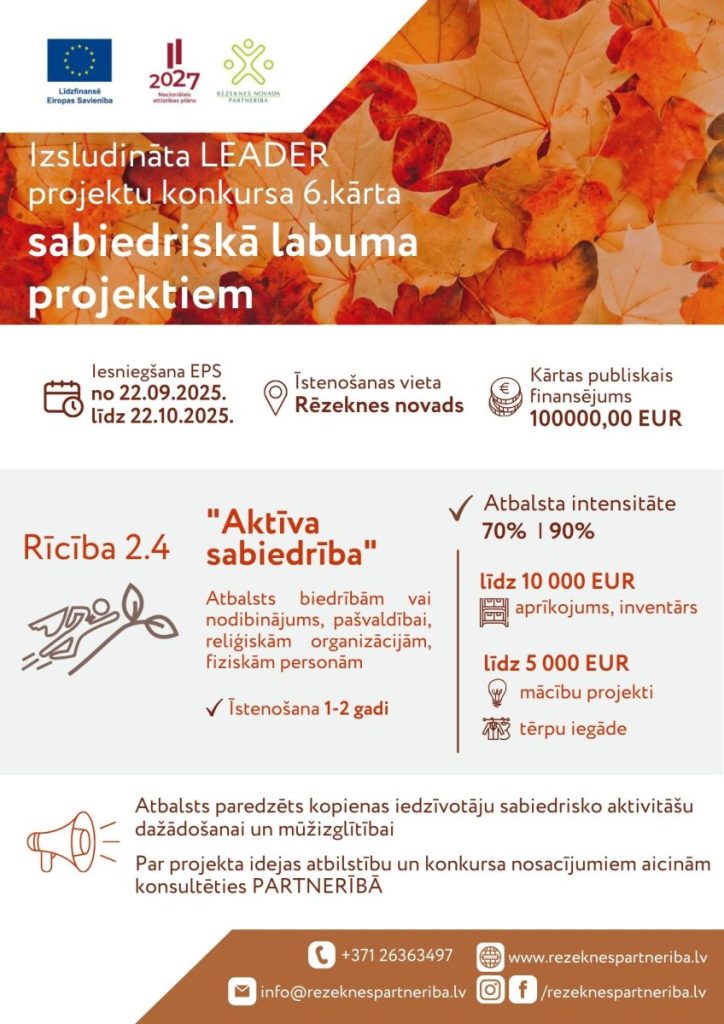 Pilns sludinājuma teksts un plašāka informācija: https://rezeknespartneriba.lv/jaunumi/2025/izsludinata-leader-projektu-konkursa-6-karta-sabiedriska-labuma-projektiem/