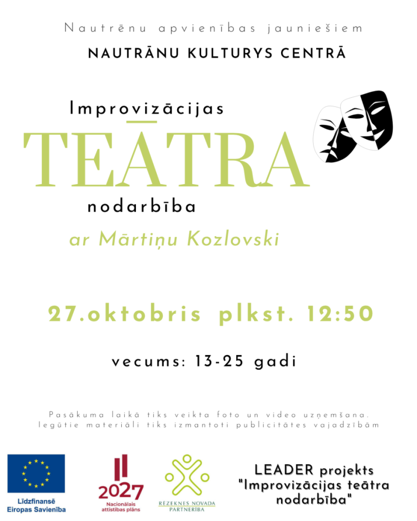 Nautrēnu apvienībā ES ELFLA intervences „Darbību īstenošana saskaņā ar sabiedrības virzītas vietējās attīstības stratēģiju, tostarp sadarbības aktivitātes un to sagatavošana” (LA 19) aktivitātē „Kopienu spēcinošas un vietas attīstību sekmējošas iniciatīvas” atbalstītā projekta “Aktīvai jaunatnei Nautrēnu apvienībā” ietvaros 27. oktobrī plkst. 12:50 Nautrēnu apvienības pagastu jauniešiem būs iespēja piedalīties aizraujošā un izzinošā improvizācijas teātra nodarbībā, kuru vadīs Mārtiņš Kozlovskis, plašāk pazīstams kā Kozmens.
