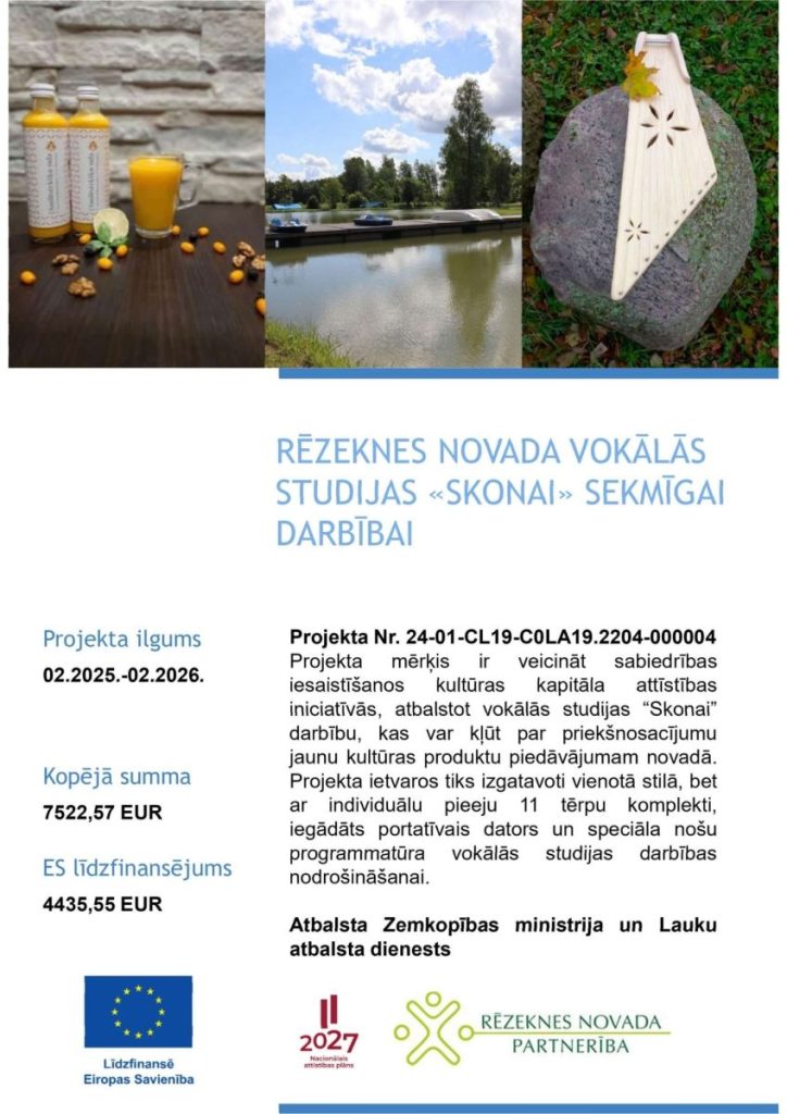 Rēzeknes novada pašvaldība īstenojusi ES ELFLA intervences „Darbību īstenošana saskaņā ar sabiedrības virzītas vietējās attīstības stratēģiju, tostarp sadarbības aktivitātes un to sagatavošana” (LA 19) aktivitātē „Kopienu spēcinošas un vietas attīstību sekmējošas iniciatīvas” atbalstīto LEADER projektu “Rēzeknes novada vokālās studijas „SKONAI” sekmīgai darbībai”.