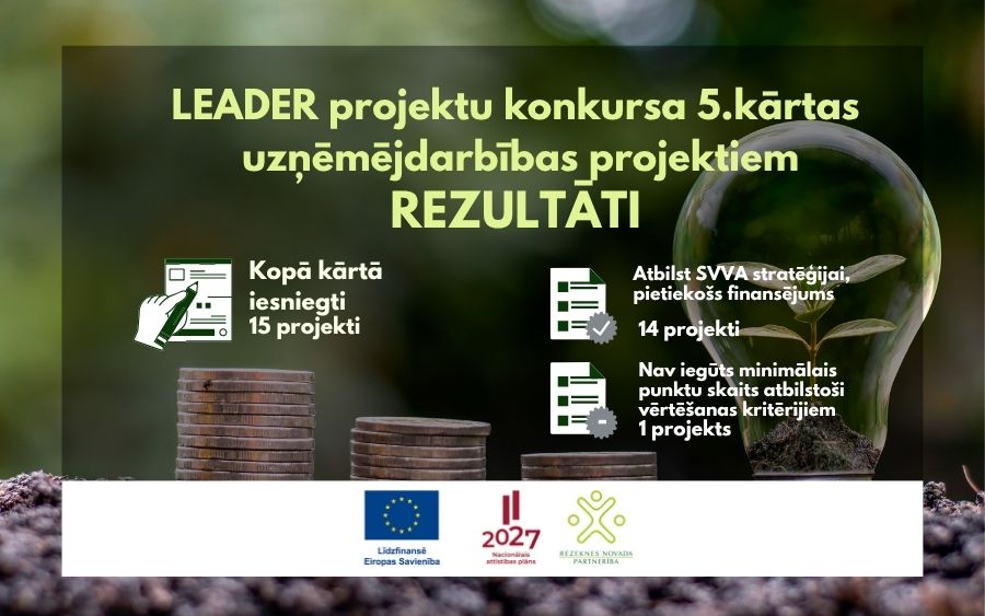 Biedrība “Rēzeknes novada partnerība” informē, ka ir pabeigta 5.kārtā iesniegto projektu vērtēšana. Projektus izvērtēja vietējās rīcības grupas projektu vērtēšanas komisija, saskaņā ar apstiprinātajiem projektu vērtēšanas kritērijiem. Projekti tika sarindoti pēc vērtējumā iegūtajiem punktiem.