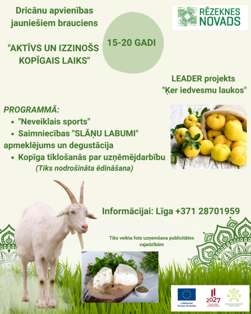 Dricānu apvienībā ES ELFLA intervences „Darbību īstenošana saskaņā ar sabiedrības virzītas vietējās attīstības stratēģiju, tostarp sadarbības aktivitātes un to sagatavošana” (LA 19) aktivitātē „Kopienu spēcinošas un vietas attīstību sekmējošas iniciatīvas” rīcībā R.2.2. “Jauniešu iniciatīvas” atbalstītā LEADER projektā “Ķer iedvesmu laukos” ietvaros tiks organizēts brauciena “Aktīvs un izzinošs kopīgais laiks” turpinājums.