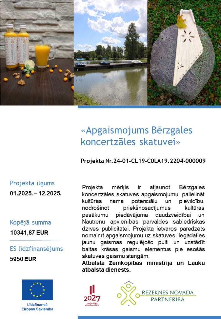 Nautrēnu apvienībā īstenots ES ELFLA intervences „Darbību īstenošana saskaņā ar sabiedrības virzītas vietējās attīstības stratēģiju, tostarp sadarbības aktivitātes un to sagatavošana” (LA 19) aktivitātē „Kopienu spēcinošas un vietas attīstību sekmējošas iniciatīvas” atbalstītais projekts “Apgaismojums Bērzgales koncertzāles skatuvei” īstenošana.